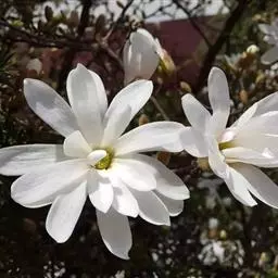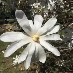 花蕾内有时包裹不同节上2-3小花蕾,形成2-3朵的聚伞花序,花梗直径3-4毫米,长1-1.3厘米,具2-3苞片脱落痕,花被片白色,通常9片,匙状倒卵形或倒披针形,长3-5厘米,内面的较狭小;雄蕊长1-2厘米,花药长0.8-1.4厘米,药隔伸出成1毫米的短尖头,花丝红色,长约1毫米;雌蕊群长1.4-2厘米,雌蕊群柄长1-2厘米,密被褐色短绒毛;心皮卵圆形或狭卵圆形、长4-5毫米。
