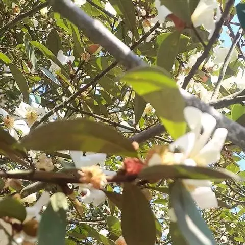 醉香含笑(学名:Michelia macclurei Dandy):乔木,高达30米,胸径1米左右;树皮灰白色,光滑不开裂;芽、嫩枝、叶柄、托叶及花梗均被紧贴而有光泽的红褐色短绒毛。叶革质,倒卵形、椭圆状倒卵形,上面初被短柔毛,后脱落无毛,下面被灰色毛杂有褐色平伏短绒毛。花蕾内有时包裹不同节上2-3小花蕾,形成2-3朵的聚伞花序,花被片白色,通常9片,匙状倒卵形或倒披针形;蓇葖长圆体形、倒卵状长圆体形或倒卵圆形;种子1-3颗,扁卵圆形。花期3-4月,果期9-11月。