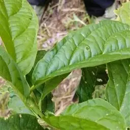单叶密集于枝的上部,叶片纸质,卵状披针形至倒卵状或椭圆状披针形,长3.5-8厘米,宽1.5-2.2(-2.5)厘米,先端急尖,具骨质短尖头,基部近圆形,偏斜不等侧,叶面绿色,疏被或密被白色小刚毛,背面淡红色或暗紫色,无毛,主脉两面稍突起,侧脉4-5对,弧曲,沿边缘网结,细脉网状,不明显;叶柄长5-7毫米,具狭翅,被短柔毛。