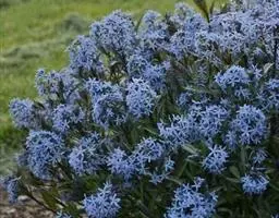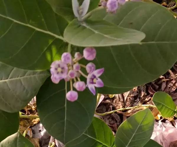 聚伞花序伞形状,腋生和顶生;花序梗和花梗被灰白色绒毛,花梗长2-2.5厘米;花萼裂片卵圆形;花冠紫蓝色,辐状,直径3-4厘米,裂片卵圆形,长1.5厘米,宽1厘米,急尖;副花冠裂片比合蕊柱短,顶端内向,基部有距。蓇葖单生,膨胀,端部外弯,长7-9厘米,直径3厘米,被短柔毛;种子广卵形,长5毫米,宽3毫米,顶端具白色绢质种毛;种毛长2.5厘米。花果期几乎全年。