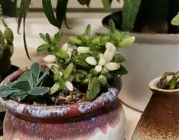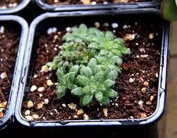 荒玉为番杏科生石花属,原产南非。株体呈白粉色,表面布满凹凸纹路,凹陷处为红褐色,每年秋季开黄花。