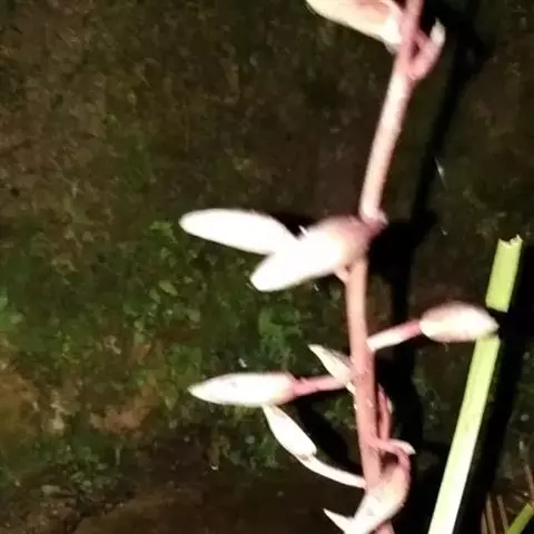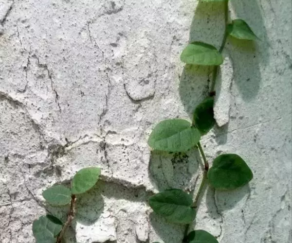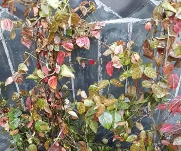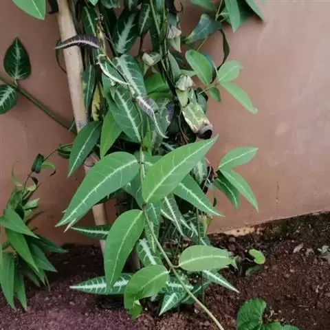 常绿木质藤蔓植物,茎有不明显皮孔。小枝、嫩叶柄及叶背面被短柔毛,老枝叶无毛。叶革质,椭圆形至卵状椭圆形或宽倒卵形,长 2-6cm,宽1-3cm。老叶近绿色或淡绿色,第一轮新叶粉红色,少数有2-3对粉红叶,第二至第三对为纯白色叶,在纯白叶与老绿叶间有数对斑状花叶,整株叶色丰富,可谓色彩斑斓。