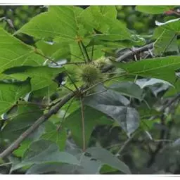 枫香树(图3) 在进行种子的采集时应选择生长10年以上、无病虫害发生、长势健壮、树干通直的优势树作为采种母树。枫香花4月上旬开花,10月下旬果实成熟。果穗球形,径2.5~3.5厘米,由多数蒴果组成。每一蒴果仅有1~2枚可孕的黑色种子,顶端具倒卵形短翅。可孕的种子有翅,为黑色;不孕种子无翅,为黄色,较淡。果实成熟后开裂,种子易飞散。当果实的颜色由绿变成黄褐(稍带青)、尚未开裂时,应将其击落,以便于收集。回的果实应置于阳光下进行晾晒,一般3~5d即可。在晾晒的过程中,应常用木锨翻动果实,待蒴果裂开后将种子取出。然后用细筛除去含有的杂质即可获得纯净的枫香种子。。以鲜果的重量进行计算,出种率为1.5%~2.0%。采集的种子应装于麻袋内置于通风干燥处进行储藏。 [3-4]