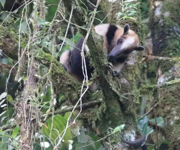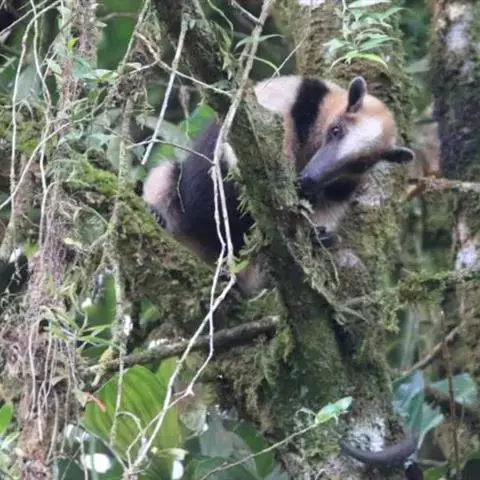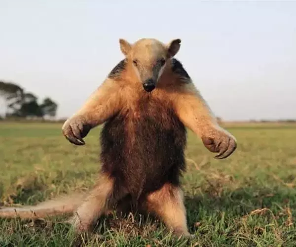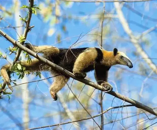 小食蚁兽见于墨西哥、特立尼达、巴西和秘鲁,体形最小,大似松鼠,不过350克,毛较短的,耳朵比较大。前肢的中间3趾有锐爪,第三趾特长,第一趾有小爪,第五趾无爪。后肢也有五趾。但是更为有趣的还是它的尾巴。这条尾巴不仅能缠绕,而且能起支柱作用。每当遇到危险时,它便以尾巴支持后部,半身挺起,宛如一副三角架。一边用前肢来威吓入侵者,一面由嘴里发出一种特殊的哨声,以此达到保卫自己的目的。小食蚁兽是一种既能树栖、又能地栖的动物。白天黑夜都可出来活动。