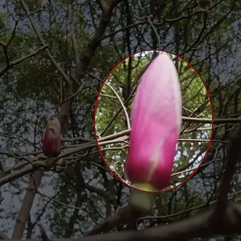 花蕾卵圆形,花先叶开放,浅红色至深红色,花被片6-9,外轮3片花被片常较短,约为内轮长的2/3。雄蕊长1-1.2厘米,花药长约6毫米,侧向开裂,药隔伸出成短尖,雌蕊群无毛,圆柱形,长约1.5厘米。聚合果长约8厘米,直径约3厘米;瞢荚卵圆形或倒卵圆形,长1-1.5厘米,熟时黑色,具白色皮孔。种子深褐色,宽倒卵形或倒卵圆形,侧扁。花期2-3月,果期9-10月。