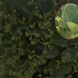 聚伞花序松散;花序梗长而细弱,长2-5厘米,顶端具3-5分枝,分枝长1.5-2厘米;小花梗长约1厘米;花紫绿色,直径1-1.2厘米;萼片近圆形;花瓣阔卵形或近圆形;花盘微4裂,雄蕊着生裂片上,无花丝;子房无花柱。