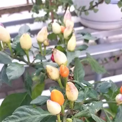 五彩椒又名五彩辣椒,是辣椒的变种,茄科辣椒属多年生草本植物,但常作一年生栽培。株高30-60厘米,茎直立,常呈半木质化,分枝多,单叶互生。花单生叶腋或簇生枝梢顶端,花多色,形小不显眼。花期5月初到10月底。果实簇生于枝端。