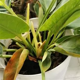 在炎热的夏季,或久雨初晴后的晴好天气,或长时间搁放于室内刚搬到室外进行恢复性养护的盆栽植株,直接暴露在阳光下直晒,很容易造成其肥嫩叶片被灼伤,致使其叶片部分失绿泛白,或整个叶片被灼伤,坏死部分后期变褐发黑。