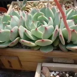 红稚莲是景天科石莲花属的多肉植物。叶片长匙形,先端稍尖,叶面光滑无粉,叶背有凸起的龙骨,…