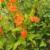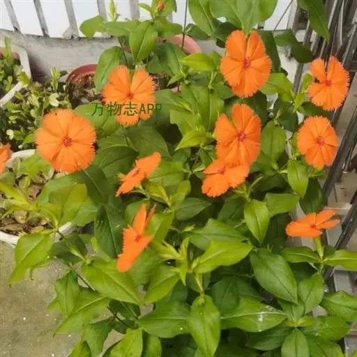 二歧聚伞花序通常具数花;花直径4-5厘米,花梗极短,被稀疏短柔毛;苞片披针形,草质,具缘毛;花萼筒状,长(25-)30-35毫米,直径3.5-5毫米,纵脉明显,无毛,萼齿披针形,长8-10毫米,顶端渐尖,边缘具缘毛;雌雄蕊柄长10-15毫米;花瓣橙红色,爪不露出花萼,狭楔形,无缘毛,瓣片轮廓倒卵形,长(15-)20-25毫米,顶端具不整齐缺刻状齿;副花冠片椭圆状;雄蕊不外露,花丝无毛。蒴果长椭圆形,长约20毫米;种子未见。花期6-7月,果期8-9月。