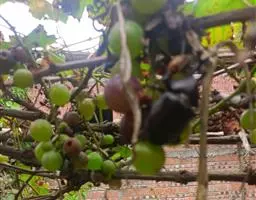 危害红提葡萄的虫害有蟋蟀和白星花金龟。蟋蟀喜欢破坏葡萄的萌芽,使得葡萄无法结出果实。药物为辛硫磷、敌百虫等,使用方法为200g辛硫磷加5kg麸皮加水拌匀,葡萄出土后均匀地撒施于田间,可以有效地杀灭蟋蟀。在此期间,不要将田间杂草清除,因为蟋蟀在有杂草吃的情况下,可以极大地减轻对葡萄芽体的危害。进行投毒防治,在蟋蟀对葡萄没有危害的时候再次进行除草。之后,对田间进行旋耕,以提高地温,促进根系快速发育生长。白星花金龟主要是对葡萄粒进行危害,其对于成熟的葡萄粒危害特别大,在防治的过程中,通过悬挂糖醋瓶进行诱杀。