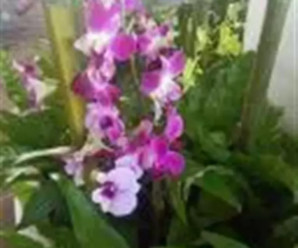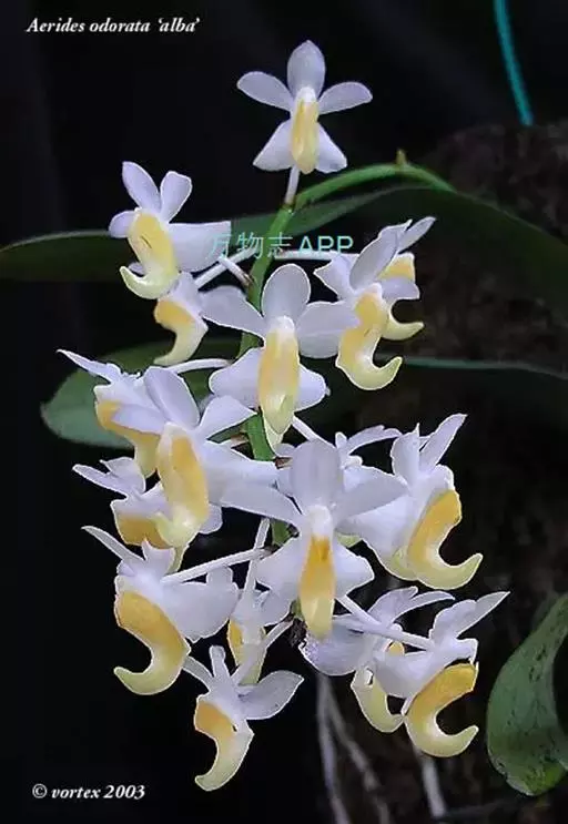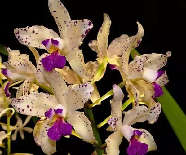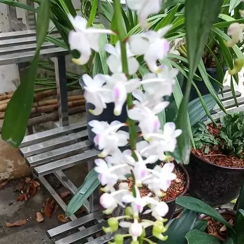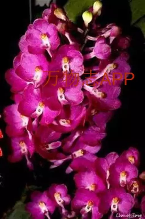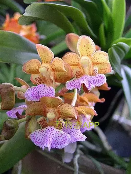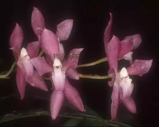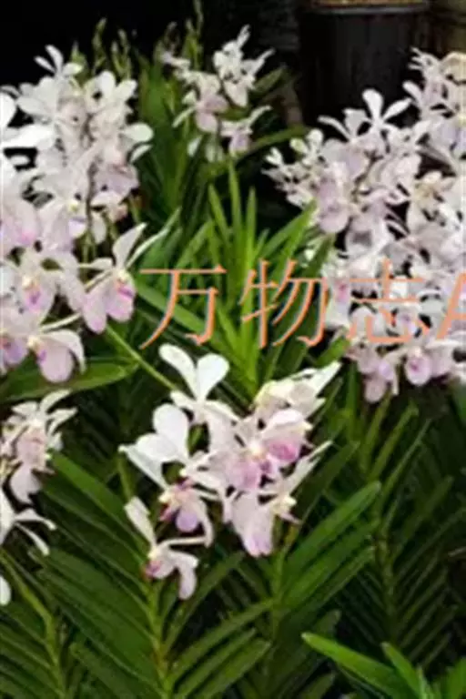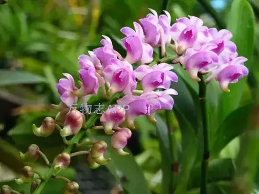 指甲兰(学名:Aerides falcata Lindl.):茎粗壮,多少伸长,具数枚二列的叶。叶带状,长20-29厘米,宽2.5-3.7厘米。总状花序疏生数朵花,花直径2-2.5厘米;萼片和花瓣淡白色,上部具紫红色;侧萼片宽卵形,基部完全贴生在蕊柱足上;唇瓣3裂;蕊柱足长达1厘米或更长;药帽前端收狭成喙状。