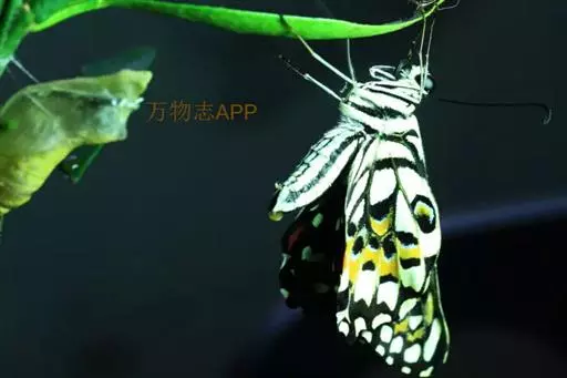 大型蝶种,展翅约为7-8cm。翅表底色为黑色,表面布满不规则的米黄色斑纹。下翅前缘有一眼状斑,肛角处有一块红褐色斑纹。 观察: 一只蝴蝶从卵→幼虫→蛹→成虫的蜕变过程。 幼虫体长约 0.3 公分,外表长满了小细毛,在它身边还有残馀的淡黄色卵壳,不过大部分的卵壳已经被它吃掉,作为营养补给品了。大多数的时间都在叶子上休息。在一次一次的蜕皮之後,体型越来越大,身上的短毛也变少了,外表看起来很像鸟粪,这是为了避免被天敌-小鸟捕食的求生策略。换上绿色的外衣以後,就进入了幼虫的最後一个阶段『终龄幼虫』。绿色的身躯上点缀著白色条纹和黑色的斑点,头部很小是褐色的,胸部和腹部是绿色的,胸部长了三对脚,腹部则有五对脚。休息时停在茎上,藉著绿色的保护色,让天敌不容易发现,如果受到攻击时,它会伸出一对红色的『臭角』,并散发出特殊的味道,甚至抬起头来露出狰狞的面目,来吓退敌人呢! 约四天以後绿色的幼虫停止进食,并且到处爬行找到合适的枝条吐丝固定,弓起身体成为『前蛹』,一天以後,最後一次蜕皮变成『蛹』。蛹期约有十天,在这个阶段,虽然蛹的外表看起来没什麼改变,但是仔细观察会发现:蛹会由绿色渐渐变 成黄绿色,表面也会有突起的纹路,看起来像是翅膀,可见蛹里的小生命正在慢慢的成长蜕变为蝴蝶呢!快要羽化时,蛹的颜色也变成半透明的,从外面就可以看到黑色带著白色斑点的翅膀呢!甚至有一只蚂蚁不小心爬到蛹上,蛹还动了几下,似乎要赶走这个误闯禁区的不速之客。蛹抖动了几下,不到一分钟美丽的蝴蝶便钻出蛹壳,做完『日光浴』以後它便展翅高飞,迎向生命的新旅程了。