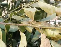 育苗期间,久雨初晴后猛然出现的烈日曝晒易使苗木出现日灼病。表现为植株外围及上部叶片整个失绿,叶表褪为灰白色至灰褐色,局部出现褪色斑,轻者出现圆形褐色斑,边缘褐色,中央色浅,重者全叶变褐、焦枯脱落。