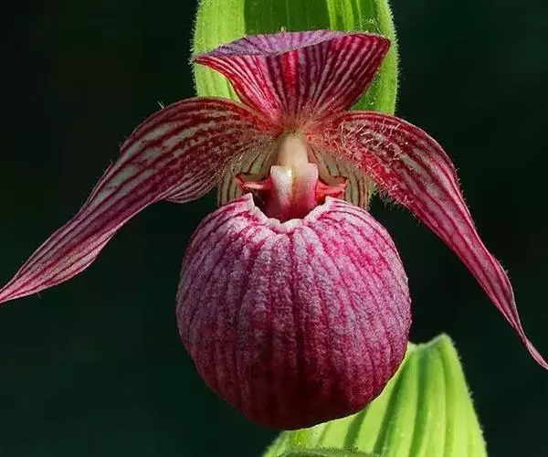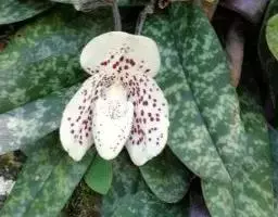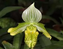 紫纹兜兰 地生或半附生植物。叶基生,二列,3-8枚;叶片狭椭圆形或长圆状椭圆形,长7-18厘米,宽2.3-4.2厘米,先端近急尖并有2-3个小齿,上面具暗绿色与浅黄绿色相间的网格斑,背面浅绿色,基部收狭成叶柄状并对折而互相套叠,边缘略有缘毛。