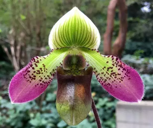 花葶直立,长12-23厘米,紫色,密被短柔毛,顶端生1花;花苞片卵状披针形,围抱子房,长1.6-2.4厘米,宽约1厘米,背面被柔毛,边缘具长缘毛;花梗和子房长3-6厘米,密被短柔毛;花直径7-8厘米;中萼片白色而有紫色或紫红色粗脉纹,合萼片淡绿色而有深色脉,花瓣紫红色或浅栗色而有深色纵脉纹、绿白色晕和黑色疣点,唇瓣紫褐色或淡栗色,退化雄蕊色泽略浅于唇瓣并有淡黄绿色晕;中萼片卵状心形,长与宽各为2.5-4厘米,先端短渐尖,边缘外弯并疏生缘毛,背面被短柔毛;合萼片卵形或卵状披针形,长2-2.8厘米,宽9-13毫米,先端渐尖,背面被短柔毛,边缘具缘毛;花瓣近长圆形,长3.5-5厘米,宽1-1.6厘米,先端渐尖,上面仅有疣点而通常无毛,边缘有缘毛;唇瓣倒盔状,基部具宽阔的、长1.5-1.7厘米的柄;囊近宽长圆状卵形,向末略变狭,长2-3厘米,宽2.5-2.8厘米,囊口极宽阔,两侧各具1个直立的耳,两耳前方的边缘不内折,囊底有毛,囊外被小乳突;退化雄蕊肾状半月形或倒心状半月形,长约8毫米,宽约1厘米,先端有明显凹缺,凹缺中有1-3个小齿,上面有极微小的乳突状毛。花期10月至次年1月。 [2-3]
