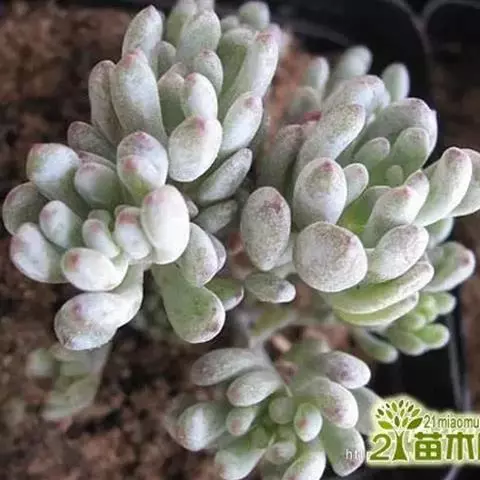 叶卵形至球形,长约3~4 cm, 厚约10~18 mm,灰绿色,在温差大、日照时间长的环境下呈现粉色,有霜粉。