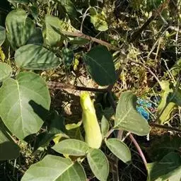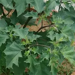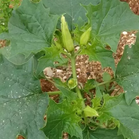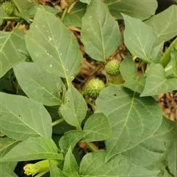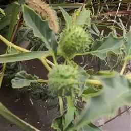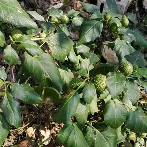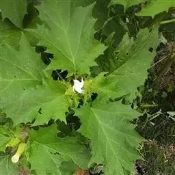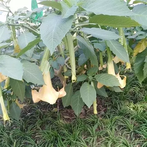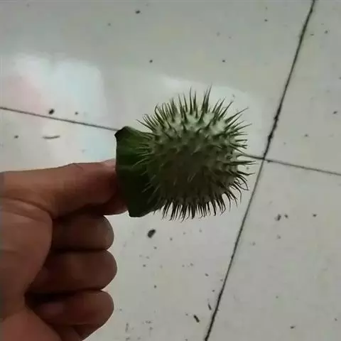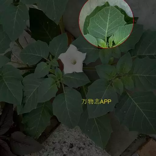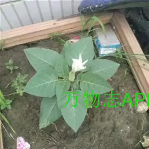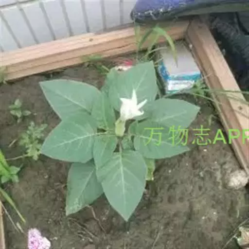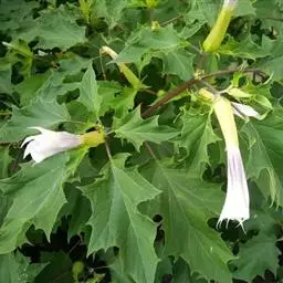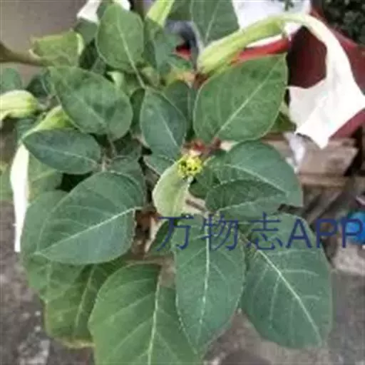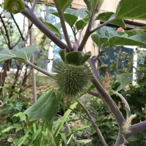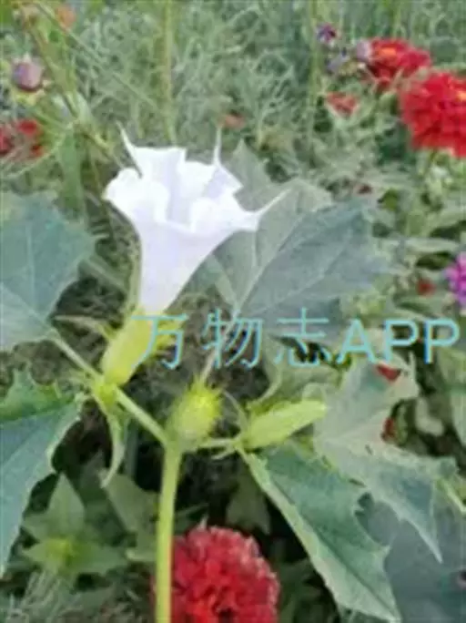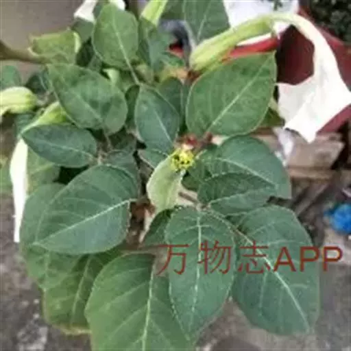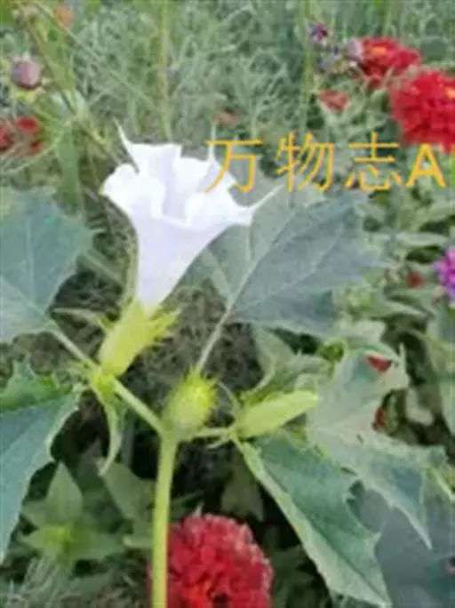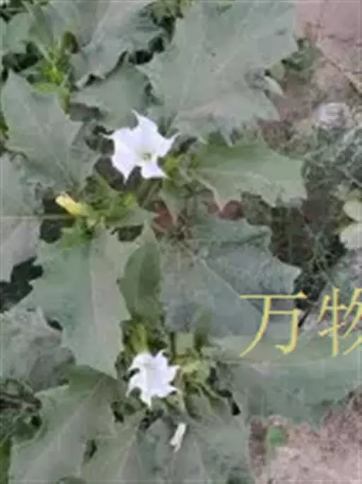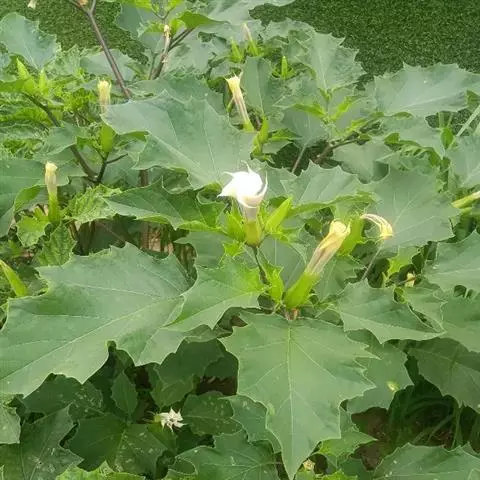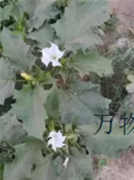 白花曼陀罗(学名:Datura metelL)是白花曼陀罗属植物,一年生草本植物,全株近于无毛。茎直立,圆柱形,高30~100cm,基部木质化,上部呈义状分枝。叶互生,上部的叶近于对生;叶柄长2~6cm,表面被疏短毛;叶片卵形、长卵形或心形,长8~14cm,宽6~9cm,先端渐尖或锐尖,基部不对称,全缘或具三角状短齿,两面无毛;叶脉背面隆起。花单生于叶胶或上部分枝间;花梗短,直立或斜伸,被白色短柔毛;花萼筒状,长4~6cm,淡黄绿色,称端5裂,裂片三角形,先端尖。功效:清火解毒,消肿止痛,杀虫止痒。