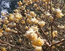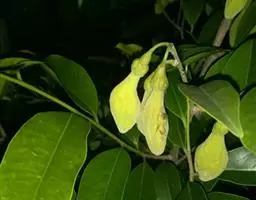 圆锥花序腋生或顶生,长5-12厘米,密被灰黄色的鳞片状毛或绒毛;每个小花序分枝处具小苞片1对;每分枝有花3-8朵,每朵花的基部具1对宿存的苞片,苞片卵形或卵状椭圆形,长6-13毫米,宽4-7毫米,具纵脉6-9条。花萼裂片5枚,覆瓦状排列,长4-5毫米,宽1-1.5毫米,内外两面均被鳞片状毛或茸毛;花瓣5枚,黄白色,芳香,长6-11毫米,宽3-7毫米,具纵脉10-14条,外面被鳞片状毛,内面近无毛;雄蕊12-15枚,长约4毫米,两轮排列,花药线状披针形,药室顶部具尖头,药隔附属体锥状;子房长卵形,3室,每室具胚珠2枚,密被白色的绢状毛,花柱细柱状,无毛,柱头小,略3裂。