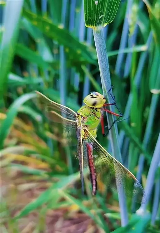 大型碧伟蜓 幼虫水虿入夏后,夜间顺着植物的茎干等爬出水面,然后渐渐羽化脱胎变成美丽的蜻蜓。这时它们的身体和翅膀湿润、柔软还无力飞行,待日光高照,晒干身体后便展翅腾飞,等到身体的颜色变得鲜艳【雄性腹部变得有性成熟的蓝色调】时才开始寻偶,一般都需要好几天,得看他的生命周期,一只蜻蜓生命中有百分之九十五以上的时间是从水里度过的。最后在空中交配,水面产卵。雌性的头是绿色,头顶是黄色透着蓝色和白色,身子是绿色,腹下有六条腿,大腿红色,小腿绿色,尾巴是红褐色透着白色条纹相间,根部俯瞰是绿色与腰一样粗,色彩丰富艳丽,层次分明,给人以强烈的美感;雄性比雌性颜色稍微深暗淡,没有比雄性漂亮,色彩不艳丽。但腹部膨大的两节雄性是蓝色的,这是雄性的显著特征。雄性羽化出水后在水边飞来飞去捕食,他们的领地意识很强,如有外来雄性侵入必驱赶之;雌性飞来便与之交配它们的强劲翅膀是蜻蜓之最,又宽又长,习惯在高空中长时间翱翔,盘旋,停留,能180度急转弯,垂直升空或降落,能悬停,也能倒着飞行,前后左右都可以。捕捉各种飞行中的小昆虫甚至白蝴蝶,边飞边吃,直立降落在树叶、草叶下方,隐蔽性很强,罕见降落。是全国各地乃至吉林地区常见的品种之一。 大型碧伟蜓与一般黄蜻对比图 即将羽化的终龄若虫