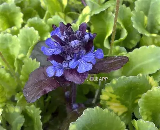 多年生常绿草本。铺地状。茎多而蔓生。叶丛莲座状,叶小,具光泽,深古铜紫色。穗状花序短,花蓝色,春季开放 。
