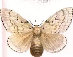 雌蛾与雄蛾的主要区别是:整体颜色比雄蛾为深;体大肥硕;触角窄;宽约2mm;腹部末端开口处椭圆形,长约6mm,宽约3~5mm;产卵器明显可见,圆形,其上有淡黄色毛。