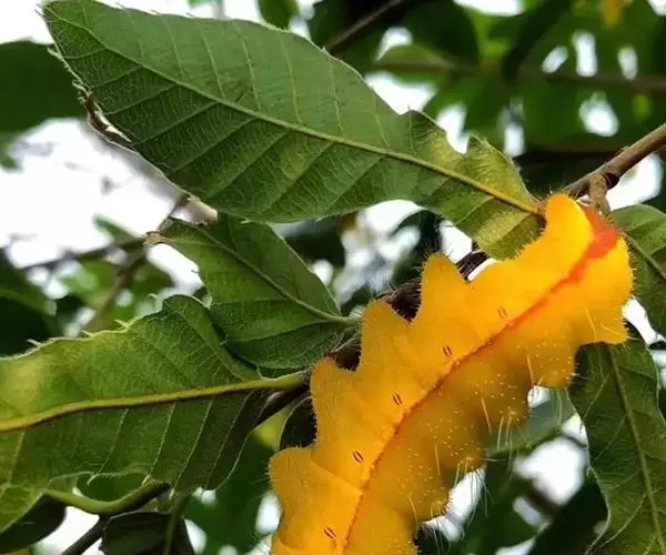 幼虫由头、胸、腹三部分组成。外观为粗壮的 幼虫 长桶形,由13个体节组成,其中胸部3个体节,腹部10个。每一胸节腹面有1对胸足,腹部第3~6节及第10节每节腹面各有1对腹足。第1胸节及第1~8腹节每节两侧各有l对气门。第2、3胸节之间有1对退化气门。除蚁蚕体色为黑色外,其他龄期体色因品种不同而异。体表生有多种突起和刚毛。柞蚕幼虫的头部为半圆形骨质构造,由触角、单眼、口器及吐丝器组成。触角主要用来感受机械刺激,单眼是幼虫的视觉器官,口器用于咀嚼柞树叶,吐丝器在蚕近于5龄期时孔口近半圆形以进行吐丝。胸部以颈膜于头部相连,由前、中、后依次增大的3个胸节组成。各胸节腹面均有1对胸足,从前到后依次增大。胸足略呈锥形,有了胸足,食叶、吐丝及爬行均方便。腹部与胸部相连,共有10节组成。第3~6腹节及第1腹节腹面各有腹足1对,腹足主要用来爬行和抓捉物体用。气门位于第1胸节及第1~8腹节两侧,共9对。气门是用来交换气体的门户,气门与内部的气管丛、纵横气管及各级分支气管构成气管系统。