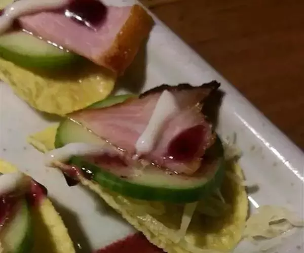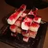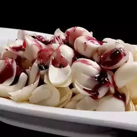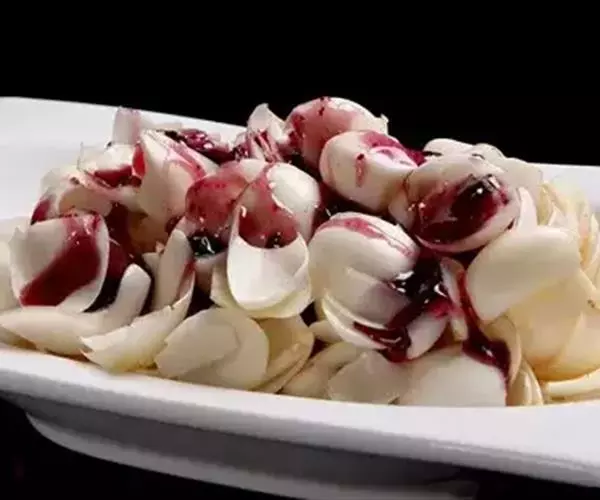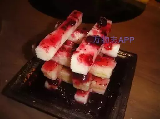 4、将经浸泡的山药条按照自己喜欢的方式摆在盘中,用适量得蓝莓酱淋在山药条上即可。