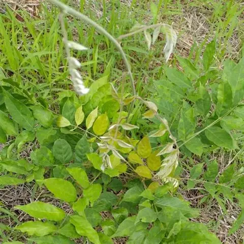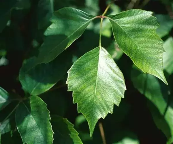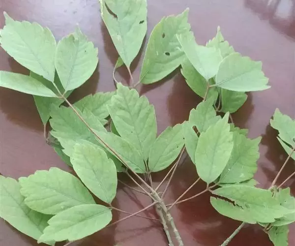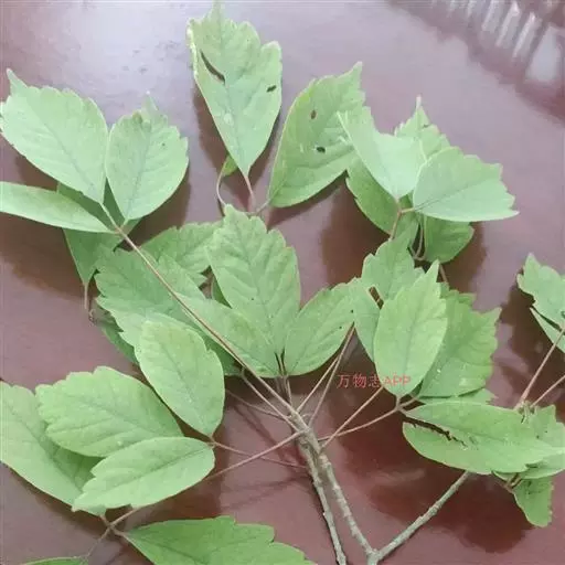 叶纸质,3小叶组成的复叶;小叶椭圆形或长圆椭圆形,长6-12厘米,宽3-5厘米,先端渐尖,基部楔形,阔楔形或近于圆形,全缘或近先端部分有稀疏的3-5个钝锯齿,顶生小叶的小叶柄长约1厘米,侧生小叶的小叶柄长3-5毫米,有短柔毛;嫩时两面无毛或有短柔毛,在下面沿叶脉被毛更密,渐老时无毛,主脉和1113对侧脉均在下面较在上面显著;叶柄长4-8厘米,有短柔毛。