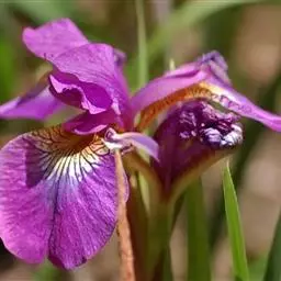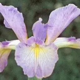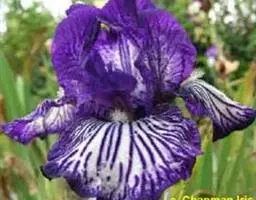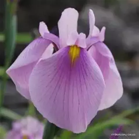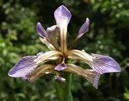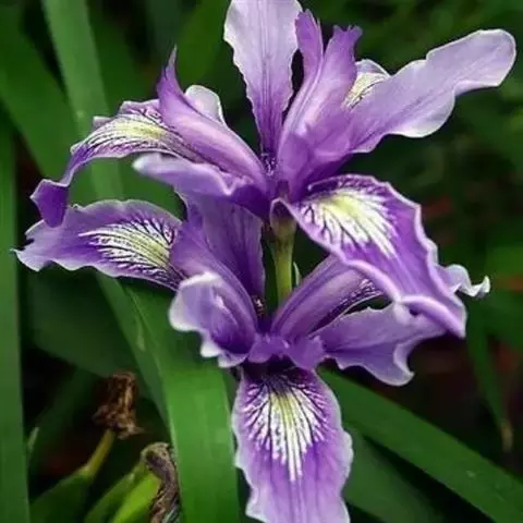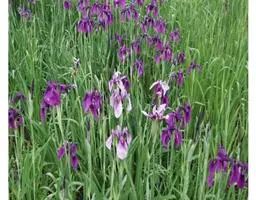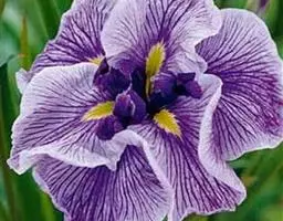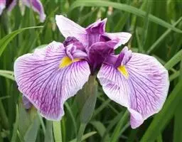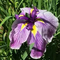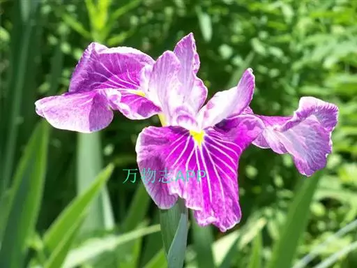 花菖蒲(学名:Iris ensata var. hortensis Makino et Nemoto):是玉蝉花的变种。多年生宿根挺水型水生花卉。根状茎短而粗,须根多并有纤维状枯叶梢,叶基生,线形,叶中脉凸起,两侧脉较平整。花葶直立并伴有退化叶1-3枚。花大直径可达15厘米。外轮三片花瓣呈椭圆形至倒卵形,中部有黄斑和紫纹,立瓣狭倒披针形。花柱分枝三条,花瓣状,顶端二裂。蒴果长圆形,有棱,种皮褐黑色。花期6-7月,果期8-9月。以日本栽培最盛,己育出一百多个品种。