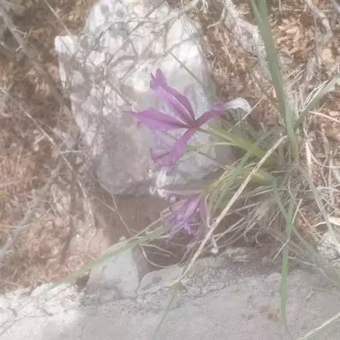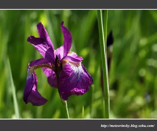 花茎圆柱形,高40-100厘米,实心,有1-3枚茎生叶;苞片3枚,近革质,披针形,长4.5-7.5厘米,宽0.8-1.2厘米,顶端急尖、渐尖或钝,平行脉明显而突出,内包含有2朵花;花深紫色,直径9-10厘米;花梗长1.5-3.5厘米;花被管漏斗形,长1.5-2厘米,外花被裂片倒卵形,长7-8.5厘米,宽3-3.5厘米,爪部细长,中央下陷呈沟状,中脉上有黄色斑纹,内花被裂片小,直立,狭披针形或宽条形,长约5厘米,宽约5-6毫米;雄蕊长约3.5厘米,花药紫色,较花丝长;花柱分枝扁平,长约5厘米,宽0.7-1厘米,紫色,略呈拱形弯曲,顶端裂片三角形,有稀疏的牙齿,子房圆柱形,长1.5-2厘米,直径约3毫米。