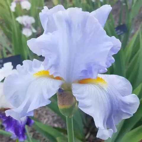德国鸢尾,为鸢尾科鸢尾属的植物。根状茎粗壮,扁圆形,有环纹;叶绿色灰绿色,堂具白粉,…
