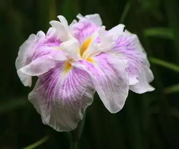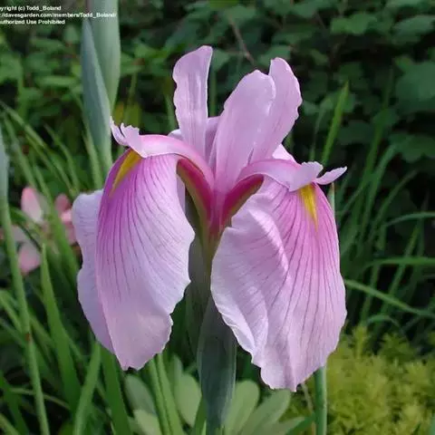 该变种(花菖蒲)为园艺变种,品种甚多,植物的营养体、花型及颜色因品种而异。叶宽条形,长50-80厘米,宽1-1.8厘米,中脉明显而突出。花茎高约1米,直径5-8毫米;苞片近革质,脉平行,明显而突出,顶端钝或短渐尖;花的颜色由白色至暗紫色,斑点及花纹变化甚大,单瓣以至重瓣。性喜潮湿,多栽于河、湖、池塘边,或盆栽。花期6-7月,果期8-9月。