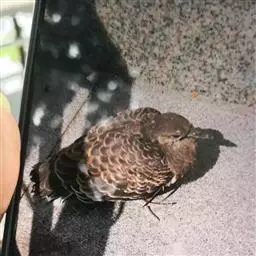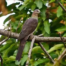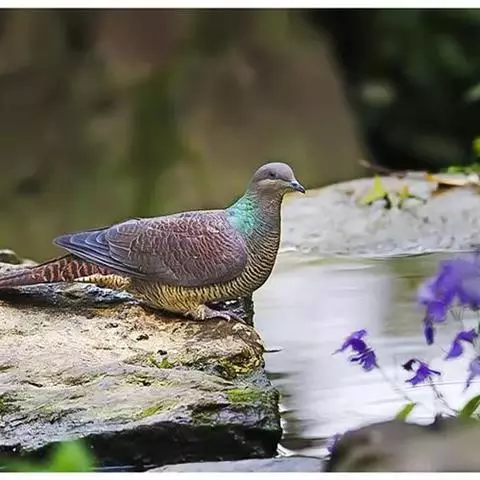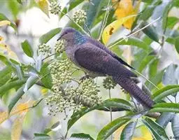 斑尾鹃鸠体长38厘米,是体大而尾长的褐色鹃鸠。背及尾满布黑色或褐色横斑。头灰,颈背呈亮蓝绿色。胸偏粉,…