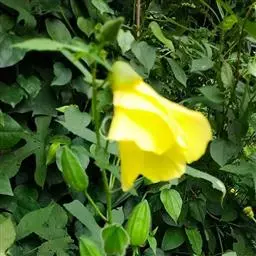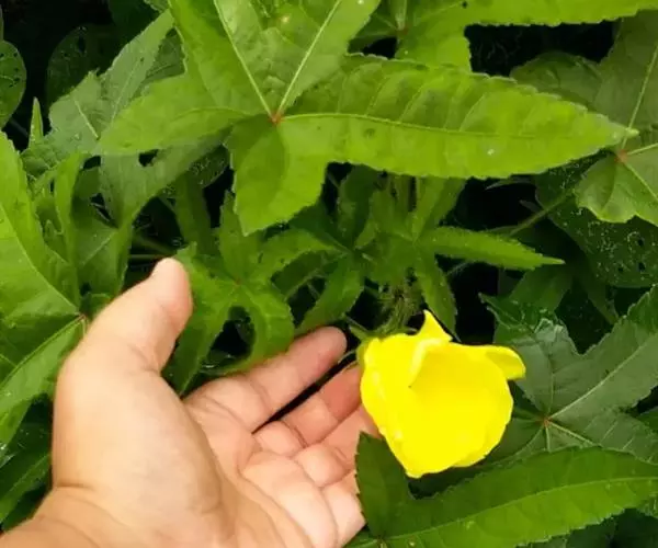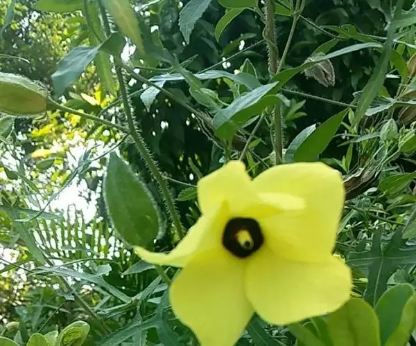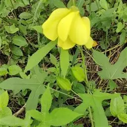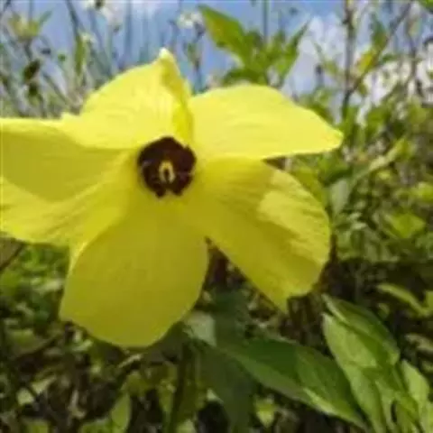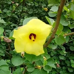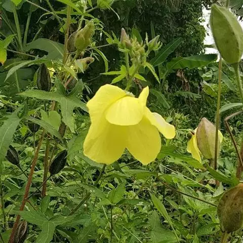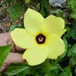 黄葵,别名:山油麻、野油麻、野棉花、芙蓉麻、鸟笼胶、假三稔、山芙蓉、香秋葵,拉丁文名:Abelmoschus moschatus Medicus。锦葵科、秋葵属一年生或二年生草本植物,被粗毛。通常叶掌状花单生于叶腋间,花萼佛焰苞状,花黄色,内面基部暗紫色,花柱分枝,柱头盘状。蒴果长圆形,种子肾形,香味。花期6~10月。常生于平原、山谷、溪涧旁或山坡灌丛中。分布中国台湾、广东、广西、江西、湖南和云南等省;越南、老挝、柬埔寨、泰国和印度等地。广植子热带地区。种子具麝香味,用水蒸汽蒸溜法可提制芳香油,含油率约0.3-0.5%,是名贵的高级调香料;也可入药。根含粘质,供制棉纸的糊料。本种花大色艳,可供园林观赏用。