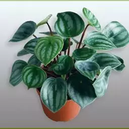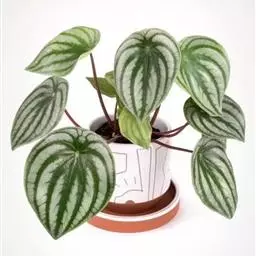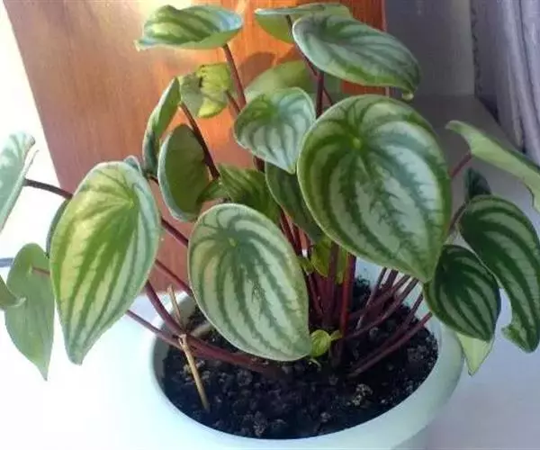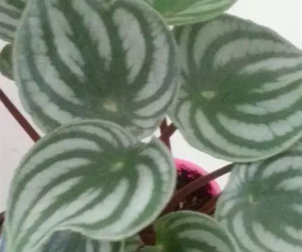 多年常绿草木,株高约15-20厘米。根茎顶端从生状抽生长长的叶柄,红褐色的叶柄上端着生单叶。叶片卵圆形至心脏形,向叶柄内反卷成半圆形,主宽脉八条,由中央向四周呈辐射状延伸,宽脉绿色,脉间银白色,叶形和色泽颇似西瓜。穗状花序,花小,白色。 西瓜皮椒草