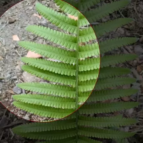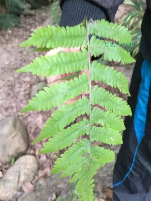 植株高达70厘米。根状茎横走,粗约4毫米,连同叶柄基部有深棕色披针形鳞片。叶近生;叶柄长达40厘米,粗约2毫米,深禾秆色,基部以上偶有一二柔毛;叶片长35厘米,长圆披针形,先端羽裂,尾状渐尖头,基部不变狭,二回羽裂;羽片12-16对,无柄,顶部略向上弯弓或斜展,中部以下的对生,相距2-3厘米,向上的互生,彼此接近,相距约1.5厘米,中部羽片长10-11厘米,中部宽1.2-1.4厘米,披针形,先端长渐尖,基部平截,略不对称,羽裂达1/2或稍深;裂片20-25对,斜展,彼此接近,基部上侧一片特长,约6-7毫米,其余的长4-5毫米,长圆形,钝头或急尖头,全缘。叶脉两面可见,侧脉斜上,单一,每裂片6-8对,(基部上侧裂片有9对,偶有二叉),基部一对出自主脉基部以上,其先端交接成一钝三角形网眼,并自交接点伸出一条外行小脉直达缺刻,第二对侧脉均伸达缺刻以上的叶边。叶草质,干后褐绿色,上面除沿叶脉有一二伏生的针状毛外,脉间疏生短糙毛,下面沿叶轴、羽轴及叶脉密生具一二分隔的针状毛,脉上并饰有橙红色腺体。孢子囊群圆形,生侧脉中部以上,每裂片(1-2) 4-6对;囊群盖小,膜质,棕色,上面密生柔毛,宿存。染色体2n=144。