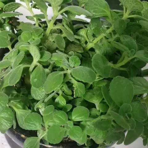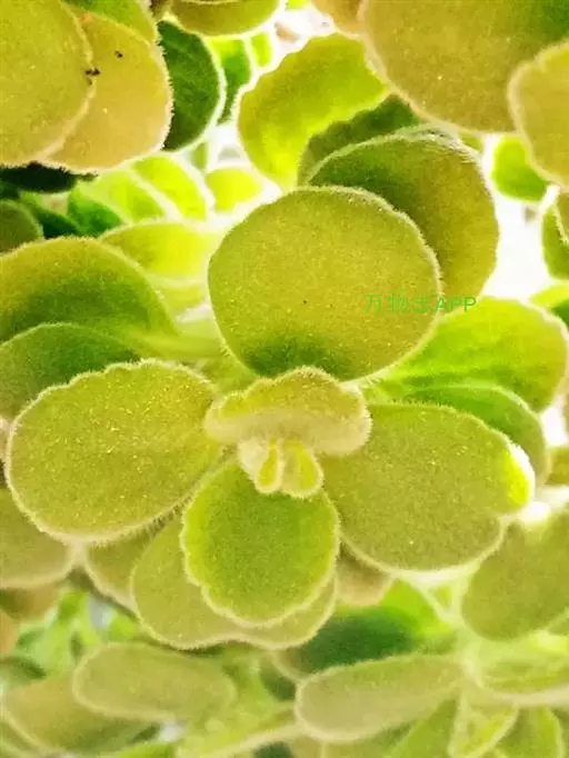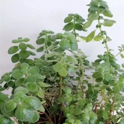 亚灌木状多年生草本植物。多分枝,全株被有细密的白色绒毛。肉质叶,交互对生,绿色,卵圆形,边缘有钝锯齿。茎细瘦,匍匐状,分枝多,叶圆形,叶片毛茸茸,花小,白色。因触碰后可散发出令人舒适的香气而享有“碰碰香”的美称。又因其香味浓甜,颇似苹果香味,故又享有“苹果香”美誉。闻之令人神清气爽。