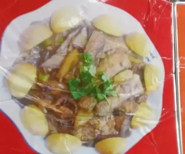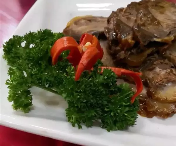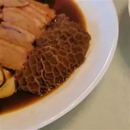 4、出品时将豆腐切片垫底,鹅胗、肝切片,鹅掌、翼修斩成小段,鹅身去骨片肉,分别摆进拼盘中。烧热卤水汁,淋在菜肴上,随手将卤水汁倒出,即可上桌。
