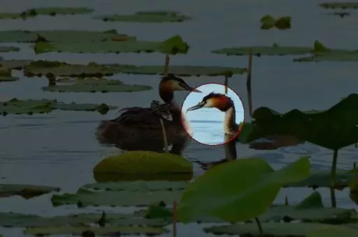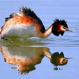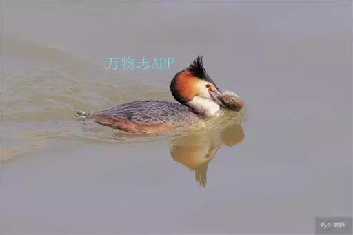 凤头鸊鷉是一种游禽。也是体形最大的一种鸊鷉,雄鸟和雌鸟比较相似,有鸭子一样大小,嘴又长又尖,从嘴角到眼睛还长着一条黑线。它的脖子很长,向上方直立着,通常与水面保持垂直的姿势。