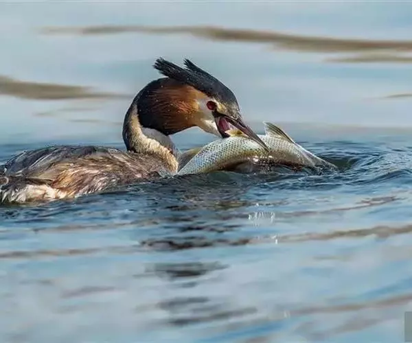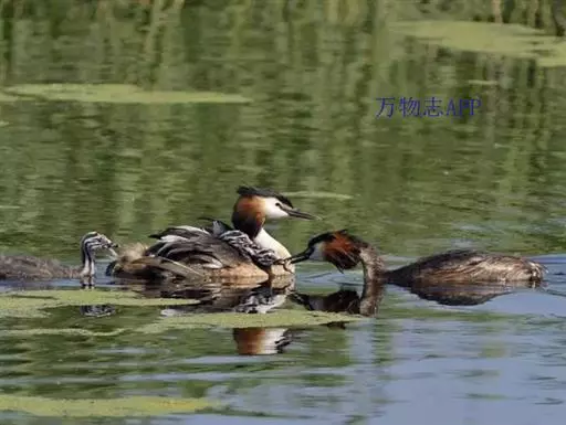 凤头鸊鷉(学名:Podiceps cristatus):体长为50厘米以上,体重为0.5-1千克。前额和头顶部黑褐色,枕部两侧的羽毛往后延伸,分别形成束羽冠。脚的位置几乎处于身体末端,尾羽短而不显,趾侧有瓣蹼。瓣蹼十分发达,除了适于游水之外,在陆地上几乎是寸步难移的。