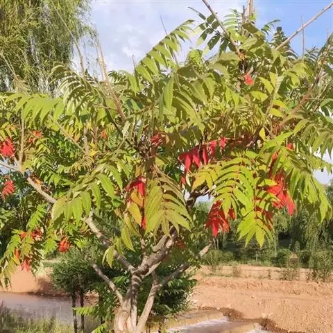 火炬树是漆树科盐麸木属落叶灌木或小乔木;株高,树形不整齐;小枝粗壮,红褐色,密生绒毛;叶轴无翅,…