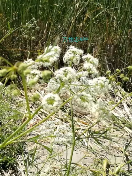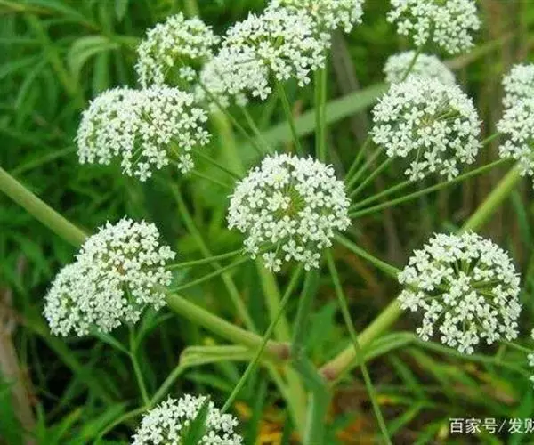 复伞形花序顶生或腋生,花序梗长2.5-10厘米,无毛;总苞片通常无或有1线形的苞片;伞辐6-25,近等长,长2-3.5厘米;小总苞片多数,线状披针形,长3-5毫米,宽0.5-0.7毫米,顶端长尖,中脉1条。小伞形花序有花15-35,花柄长4-7毫米;萼齿明显,卵状三角形;花瓣白色,倒卵形或近圆形,长1.5-2毫米,宽1-1.5毫米,顶端有内折的小舌片,中脉1条;花丝长约2.5毫米,花药近卵圆形,长约0.7毫米,宽0.5毫米;花柱基幼时扁压,光滑;花柱短,长约1毫米,向外反折。分生果近卵圆形,长、宽2-3毫米,合生面收缩,主棱阔,木栓质,每棱槽内油管1,合生面油管2;胚乳腹面微凹。花果期7-8月。
