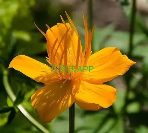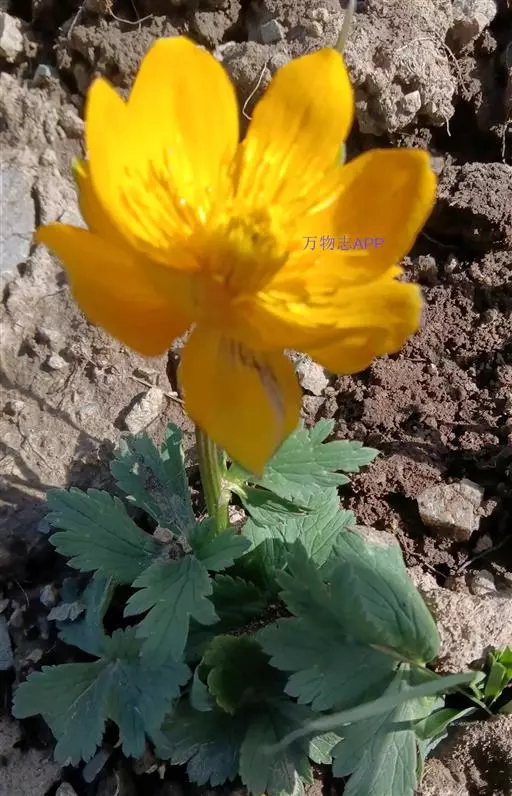 植株全体无毛。须根长达7厘米。茎高30-70厘米,不分枝,疏生(2-)3-4叶。基生叶1-4个,长16-36厘米,有长柄;叶片五角形,长3.8-6.8厘米,宽6.8-12.5厘米,基部心形,三全裂,全裂片分开,中央全裂片菱形,顶端急尖,三裂达中部或稍超过中部,边缘密生稍不相等的三角形锐锯齿,侧全裂片斜扇形,二深裂近基部,上面深裂片与中全裂片相似,下面深裂片较小,斜菱形;叶柄长12-30厘米,基部具狭鞘。茎生叶似基生叶,下部的具长柄,上部的较小,具短柄或无柄。花单独顶生或2-3朵组成稀疏的聚伞花序,直径3.8-5.5厘米,通常在4.5厘米左右;花梗长5-9厘米;苞片三裂;萼片(6-)10-15(-19)片,金黄色,干时不变绿色,最外层的椭圆状卵形或倒卵形,顶端疏生三角形牙齿,间或生3个小裂片,其他的椭圆状倒卵形或倒卵形,顶端圆形,生不明显的小牙齿,长1.5-2.8厘米,宽0.7-1.6厘米;花瓣18-21个,稍长于萼片或与萼片近等长,稀比萼片稍短,狭线形,顶端渐狭,长1.8-2.2厘米,宽1.2-1.5毫米;雄蕊长0.5-1.1厘米,花药长3-4毫米;心皮20-30。蓇葖长1-1.2厘米,宽约3毫米,具稍明显的脉网,喙长约1毫米;种子近倒卵球形,长约1.5毫米,黑色,光滑,具4-5棱角。6-7月开花,8-9月结果。