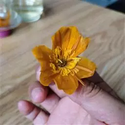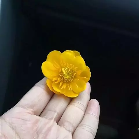 (2)宽瓣金莲花 花皱缩,湿润展平后,直径2.5-4.8cm;萼片10-20,橙黄色,宽椭圆形或倒卵形,长1-2.2cm,宽0.6-1.7cm,全缘或先端有不整齐小齿;花瓣18-22棕色,匙状线形,与萼片等长或稍短;雄蕊多数;于房多数,聚合,花柱短尖。气微,味苦。