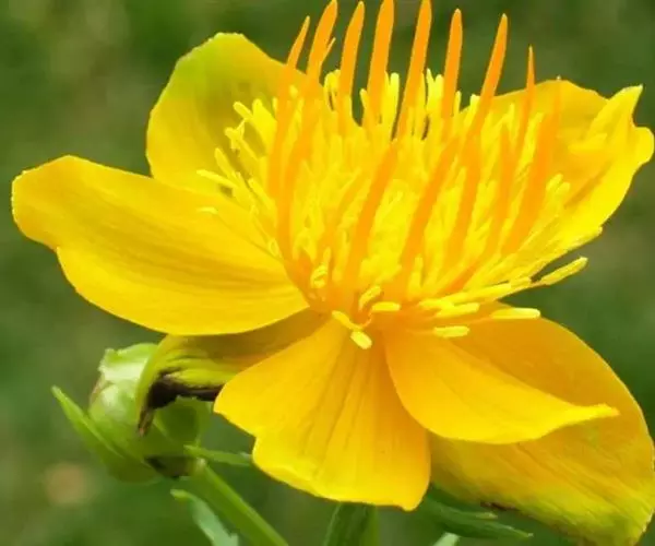 (3)矮金莲花 花单生,花梗长;萼片5,黄色,宽倒卵形;花瓣匙状线形,棕色;雄蕊多数。气微,味苦。