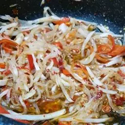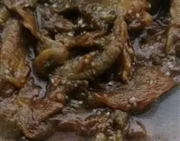 4、放油(适量),放葱头,爆炒至出香味。放入背干水的茶树菇,爆炒.