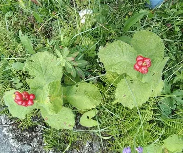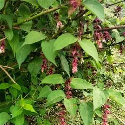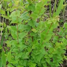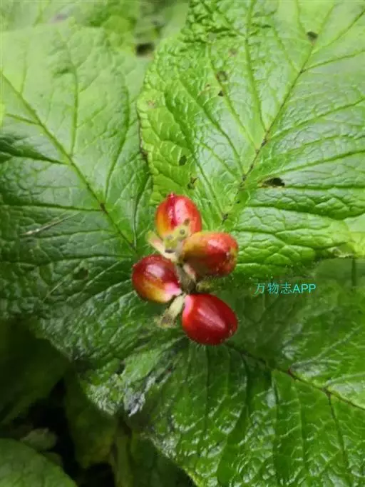 穿心莛子藨(Triosteum himalayanum Wall)忍冬科,莛子藨属,多年生草本,高30~50厘米,全体被粗毛。根粗壮,圆锥形,分叉,暗褐色。茎直立,单生。叶对生,无柄,基部愈合为一体,而茎贯穿中心;叶倒卵形,长10~20厘米,宽6~13厘米,先端钝或急尖,全缘或呈波状。穗状花序顶生;花淡紫色;萼管卵形,裂片5,宿存;花冠狭漏斗状,裂片5,不等;雄蕊5,花药内藏;子房下位。浆果卵形;具种子3粒。