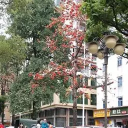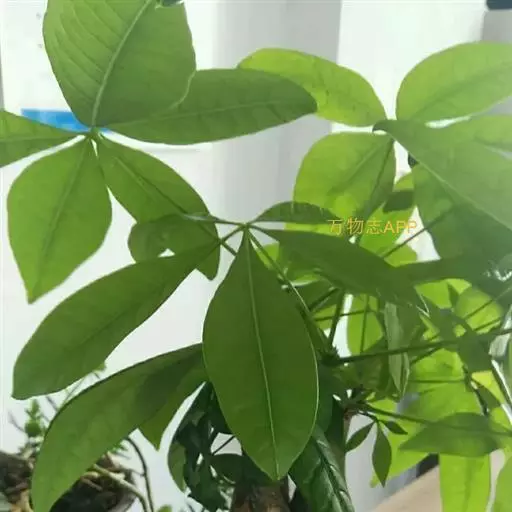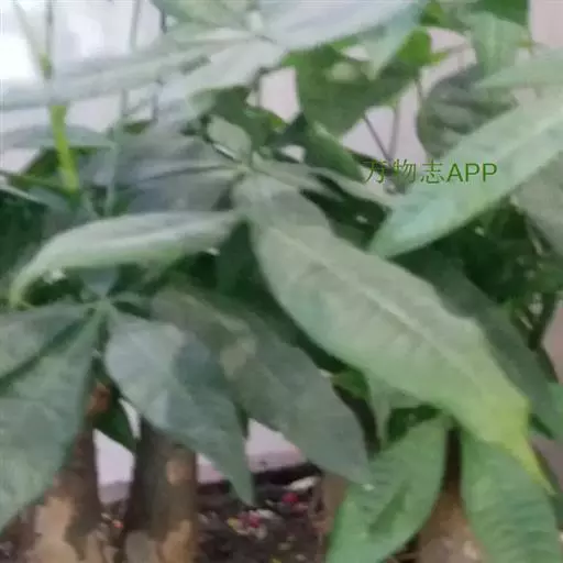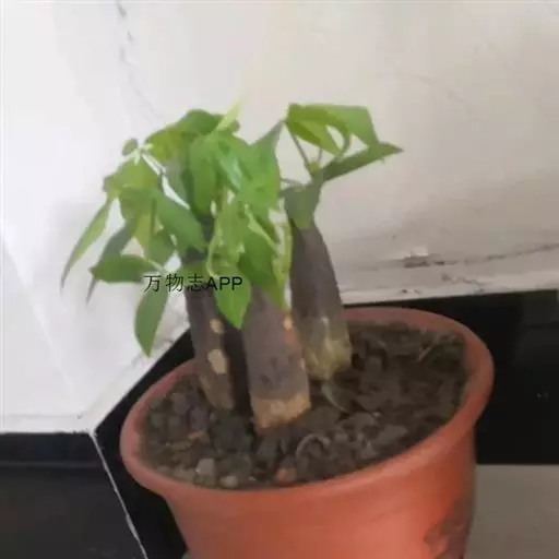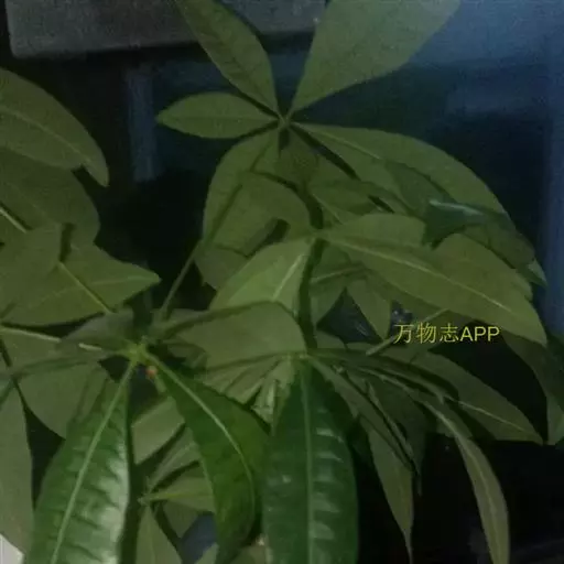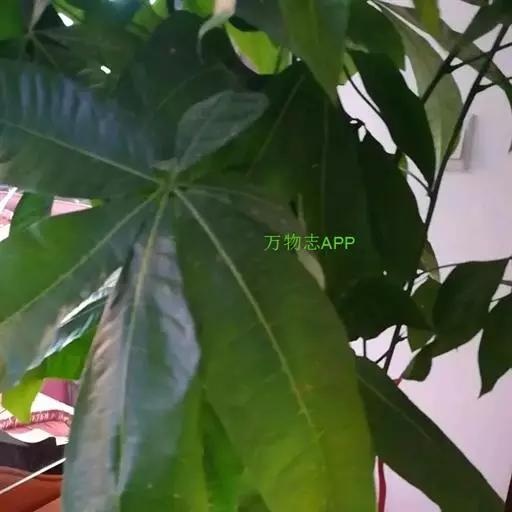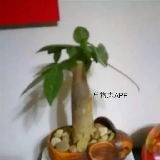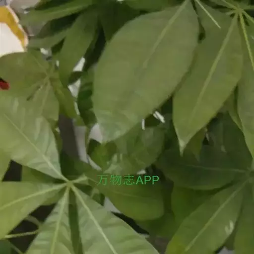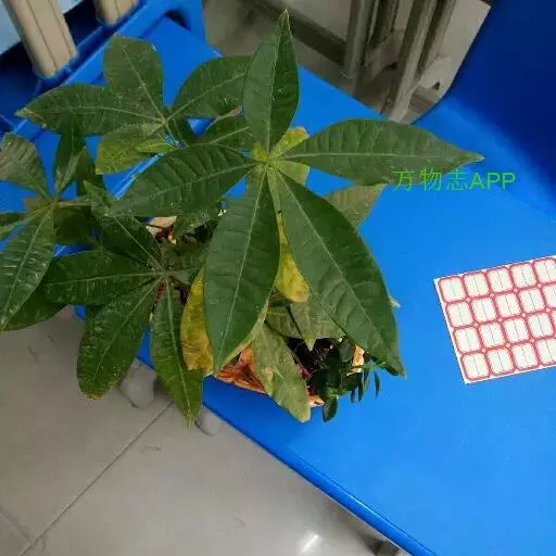 瓜栗(学名:Pachira macrocarpa (Cham. et Schlecht.) Walp. ),俗称发财树,木棉科小乔木,高4-5米,树冠较松散,幼枝栗褐色,无毛。小叶具短柄或近无柄。花单生枝顶叶腋;花梗粗壮,被黄色星状茸毛,脱落;萼杯状,近革质;花瓣淡黄绿色,狭披针形至线形,上半部反卷;雄蕊管较短,花丝连雄蕊管长13-15厘米,下部黄色,向上变红色,花药狭线形,弧曲;花柱长于雄蕊,深红色。蒴果近梨形,果皮厚,木质,几黄褐色,外面无毛,内面密被长绵毛,开裂,每室种子多数。种子大,不规则的梯状楔形,表皮暗褐色,有白色螺纹,内含多胚。花期5-11月,果先后成熟,种子落地后自然萌发。