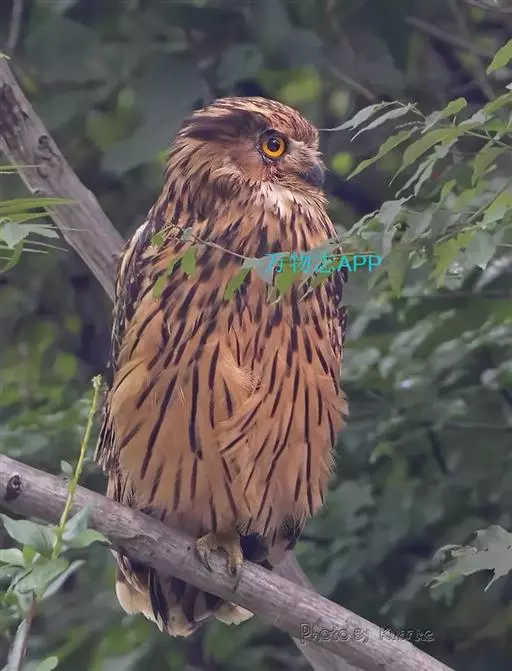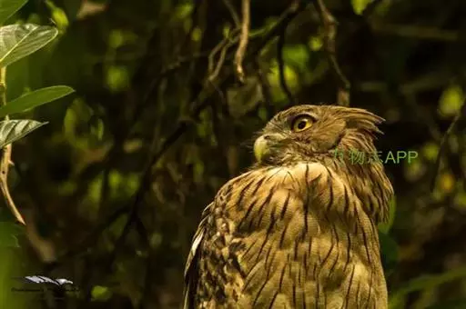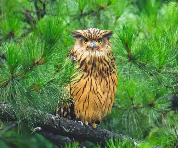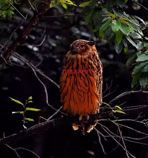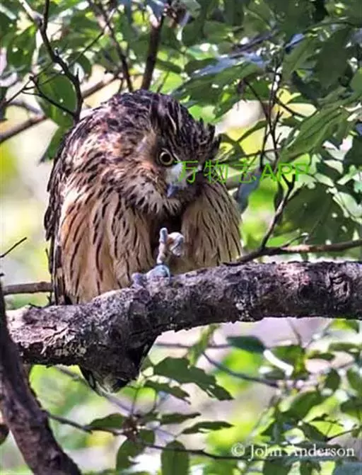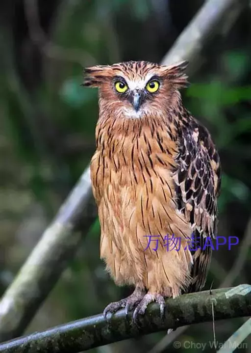 体型硕大(61厘米)的棕色渔鸮。具耳羽簇,眼黄,具蓬松的白色喉斑。上体:棕黄色,具醒目的深褐色纵纹但纹上无斑。与雕鸮的区别在眼黄而 脚无被羽。与褐渔鸮区别在下体棕色明快,上体纵纹更重,叫声也不同。 虹膜-黄色;嘴-角质黑色,蜡膜绿色;脚-偏灰。 叫声:深沉的whoo-hoo叫声及猫样喵叫。